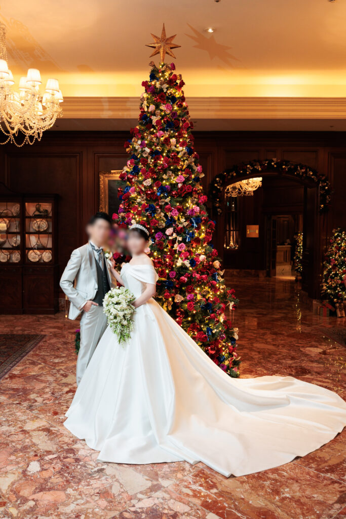 柱の木目、両脇のお花、奥のクリスマスツリーなど、
