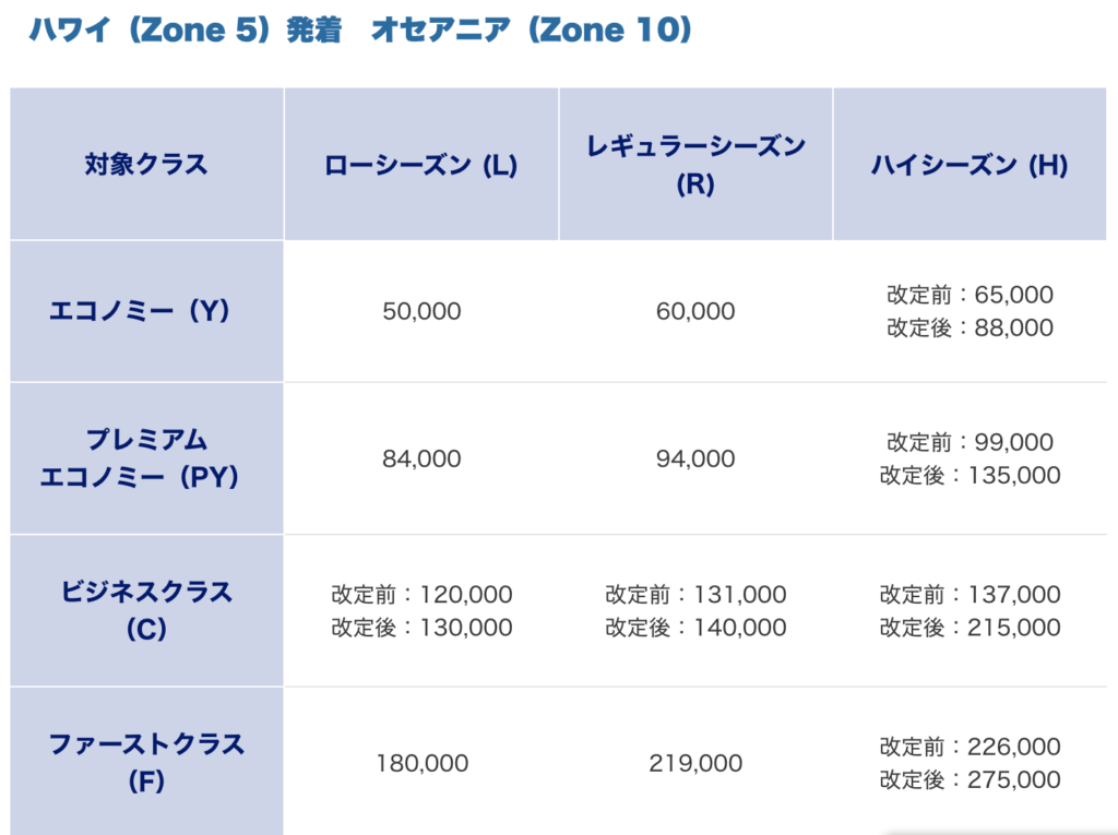 航空券に必要なマイル数(ローシーズン想定)